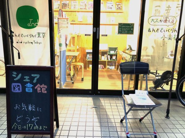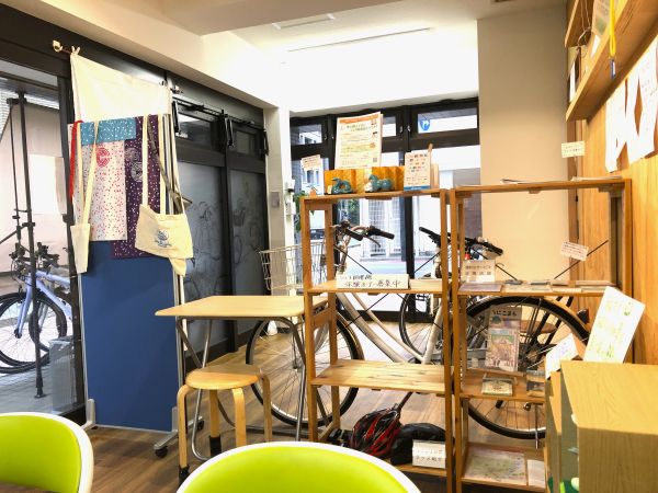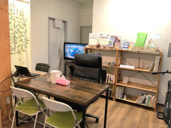 レンタサイクルのスペースと明確に分けて、仮設ですが、本棚と読書・作業スペースの位置を固定しました。