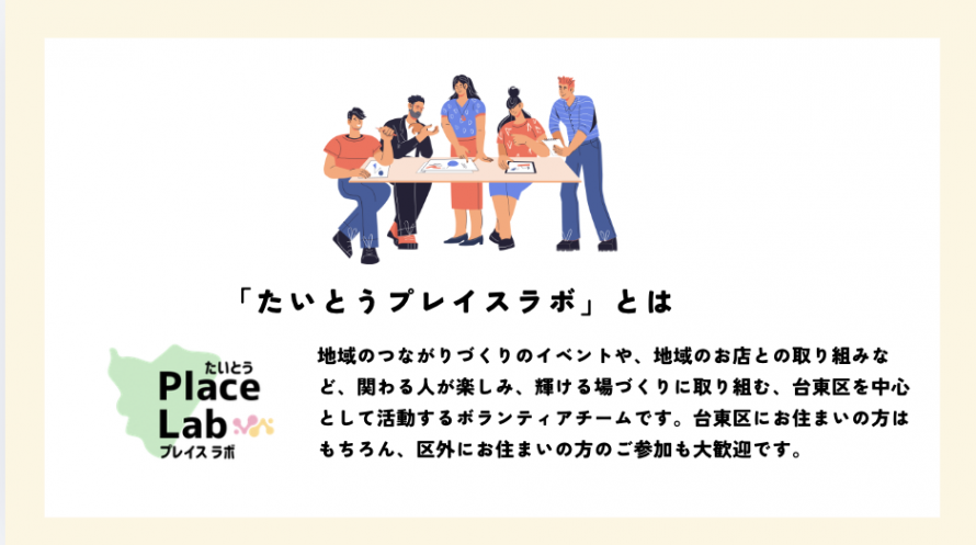 たいとうプレイスラボは、地域のつながりづくりのイベントや、地域のお店との取り組みなど、関わる人が楽しみ、輝ける場づくりに取り組む、台東区を中心として活動するボランティアチームです。